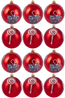 This pack of twelve baubles are red and contain two different hand painted designs which are perfect for accessorizing your tree this Christmas.