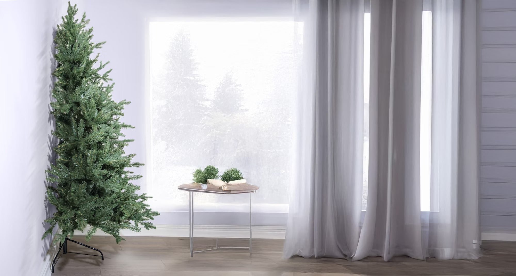 If you want the shape of a full Christmas tree without giving up space, a slim or pencil Christmas tree is an excellent choice. These tall, narrow silhouettes tuck perfectly into corners or between furniture, offering that focal point feel without the bulk.
