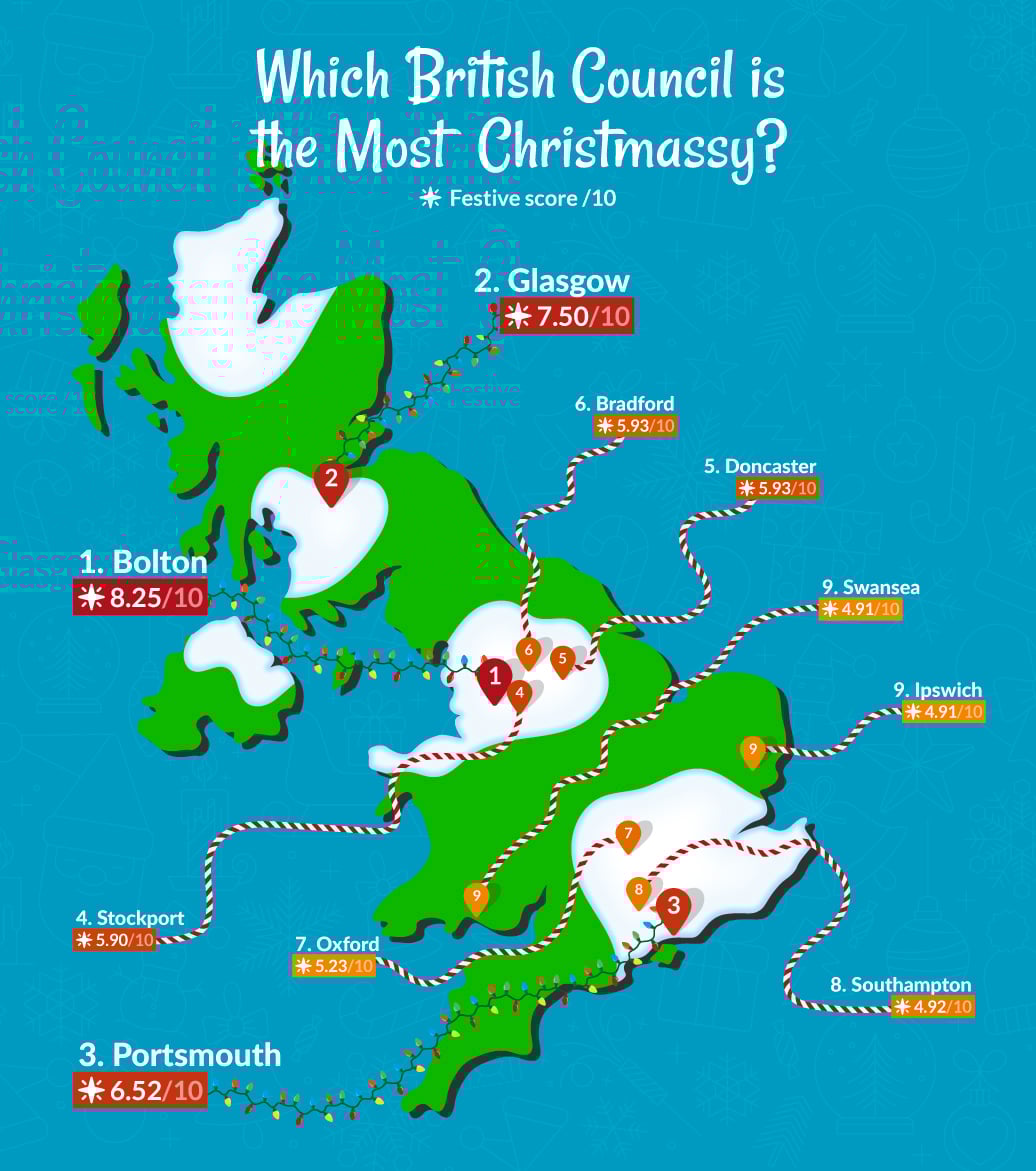 Bolton may not have the largest budget, but it makes the most of what it has. With a spend of £0.37 per person, only slightly higher than the national average, the council still ranked the most festive in Britain overall.