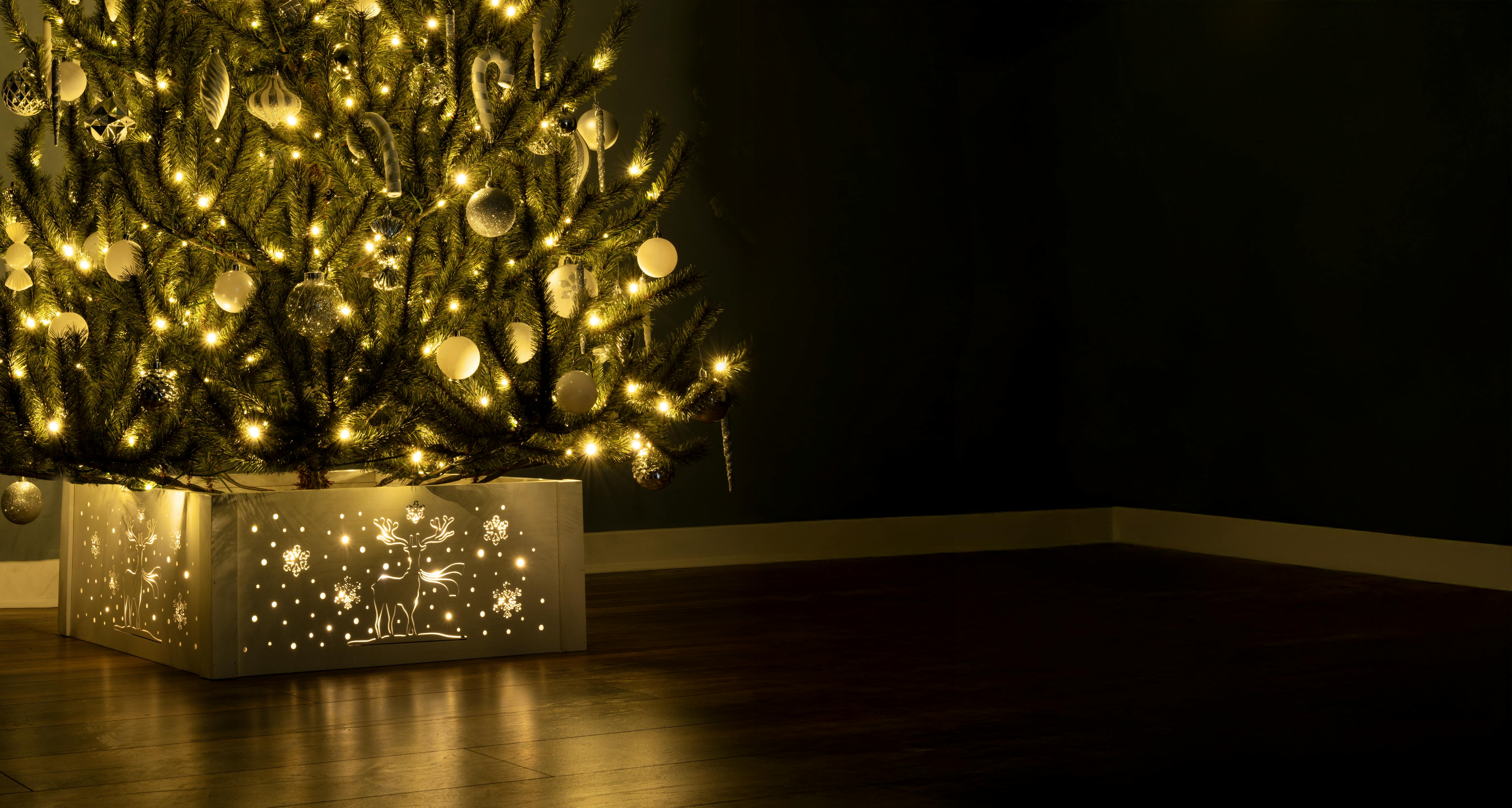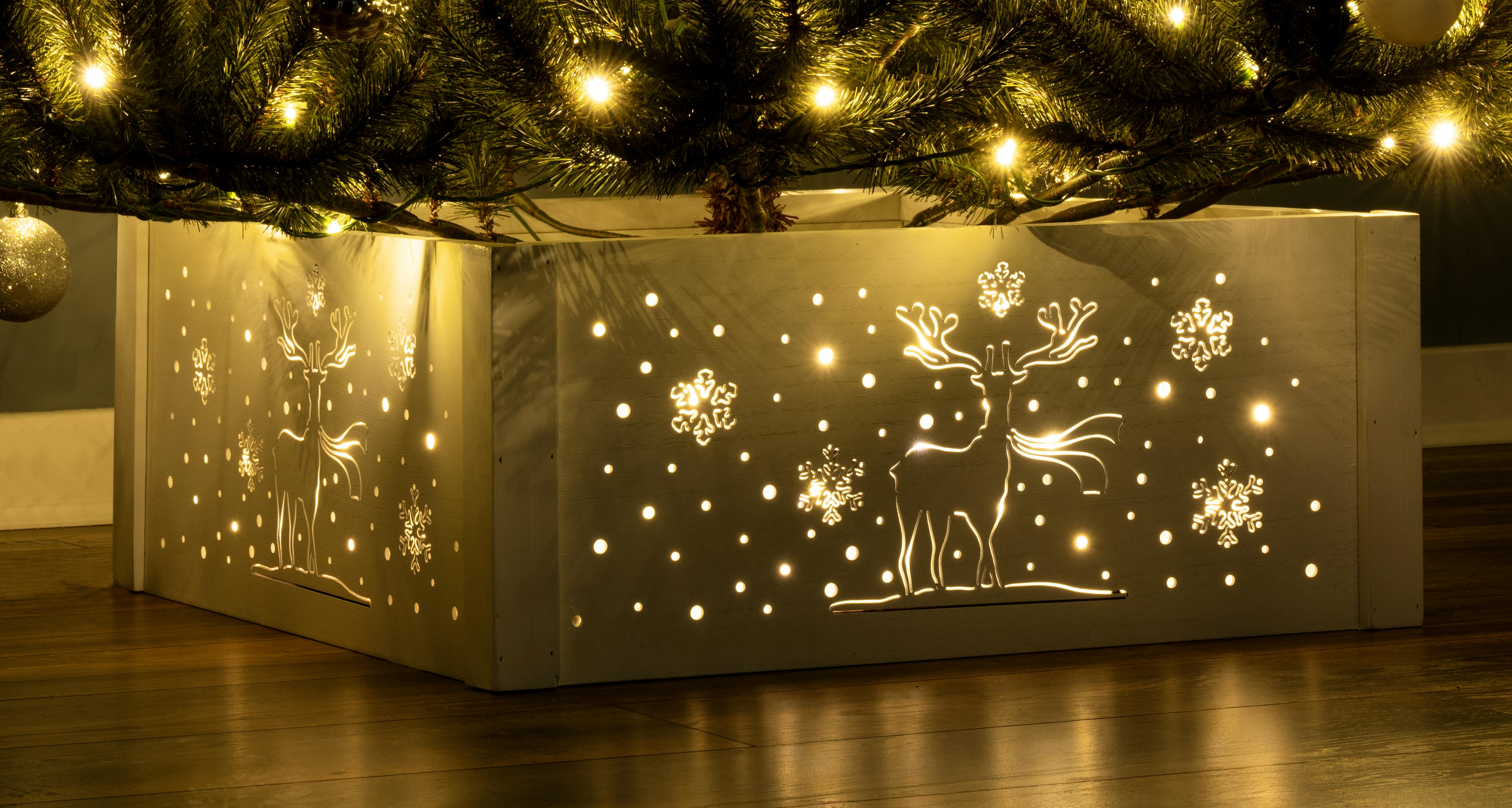 Made to complement realistic Christmas trees, this pre-lit wooden Christmas tree skirt with snowflake & stars design provides the perfect foundation for any festive scene. Simply plug in to the wall for a dazzling display that decorates every inch of your tree.